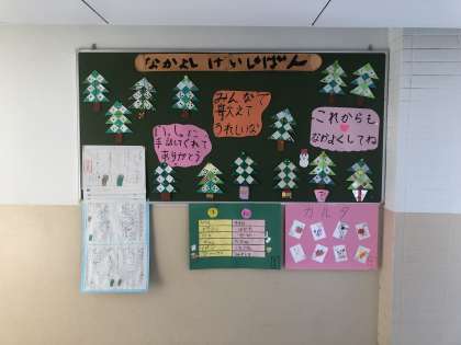 なかよしの掲示板には、折り紙で作ったクリスマスツリーを飾っています。