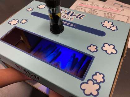 まず保健委員のみんなで手洗い実験をしました。手に特殊なクリームを塗ったあと、普段の手洗いをし、ブラックライトのついた箱に手を入れて、しっかり洗えているか確認しました。クリームが洗い流されていない所は白く光ります。これで、洗い残しがよくわかります。ほとんどの人が手の甲や指と指の間などがよく洗えていない事がわかりました。