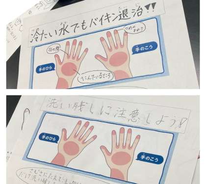 その後、今回の実験で感じた事をもとに、三国小学校のみんなが上手に手洗いできるようにポスターを作って、手洗い場にはります。