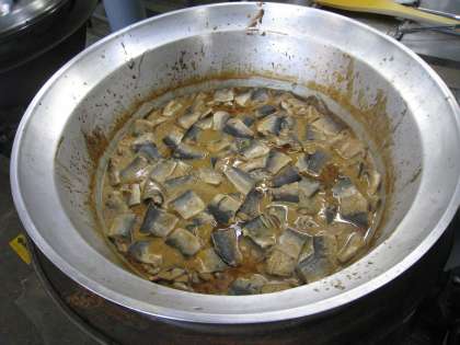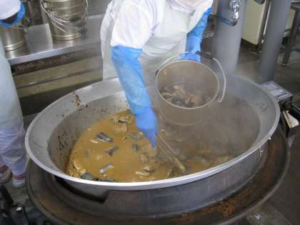 さばのみそ煮は、大きな釜でじっくり煮込んで作りました。