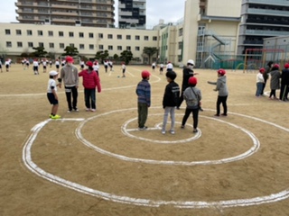 うずまきをぐるぐる回りながらじゃんけんをして、相手の陣地まで行けた回数を競いました。