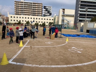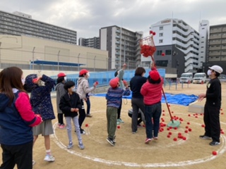 今日は、運動場で「冬のなかよしオリンピック」をチーム対抗でしました。