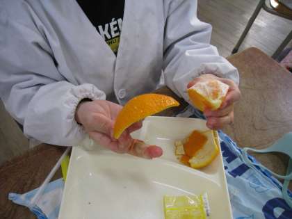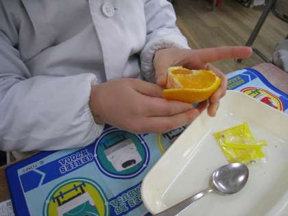 デコポンは、一人1/4切ずつです。入学した頃は、皮をむくことがなかなかできなかった1年生も、上手にむけるようになりました。