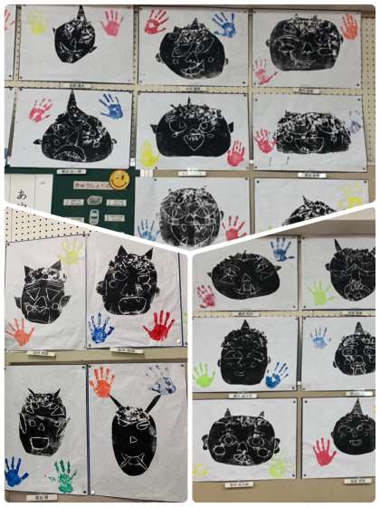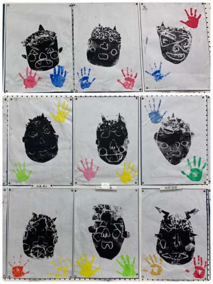 2年生では、3学期の図工で鬼の顔の紙版画を作っていました。