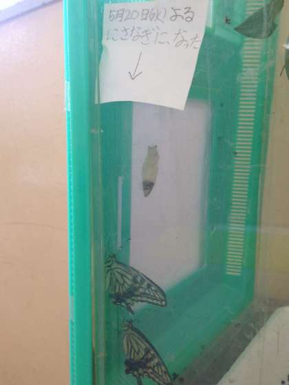 学校に来るとアゲハが羽化していました!さなぎになってから10日目でした。