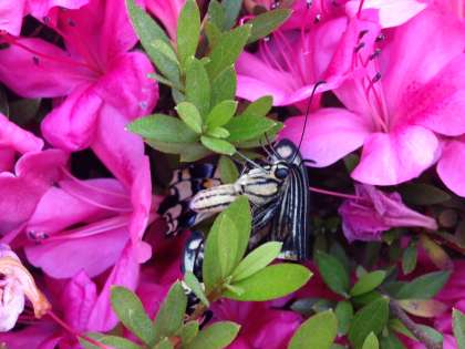 でも、羽が伸びずに縮まったままのアゲハも…卵、幼虫、さなぎと、ここまで育ったのに飛べないチョウで、かわいそう…とまゆをしかめるこどもたちでしたが、これも自然の厳しさです。長くは生きられないかもしれませんが、せめてみつが吸えるように校庭のつつじの花にとまらせてあげました。
