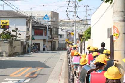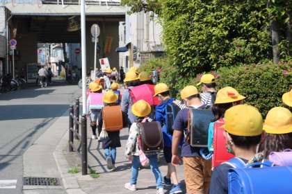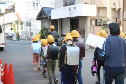 6年生や5年生のお兄さんお姉さんが、1年生に優しく関わったり、歩行中に1年生の方を振りかえり、1年生が列から離れないようにしたりしていました。