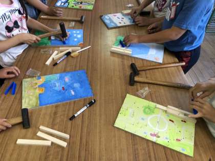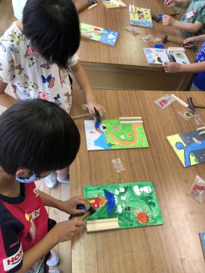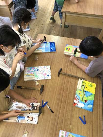 金づちの重さと、くぎを真っ直ぐに打つことに四苦八苦しながらも、「めっちゃ上手に打てたー」「早く、真っ直ぐ打てるようになったー」とどんどん上手くなる喜びを噛みしめていました。