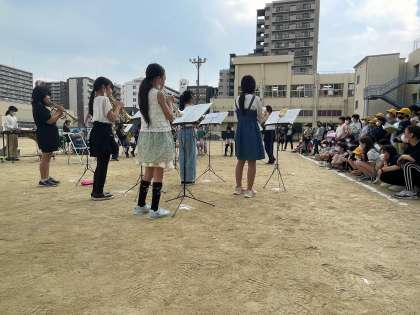 三国ジュニアバンドでは新入生を募集するために、水曜日に全校集会で動画を上映し、金曜日は校庭でミニコンサートを行いました。