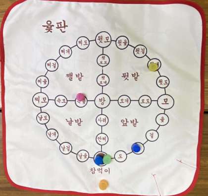 ユンノリは、日本のすごろくのような遊びです。4本の棒を投げ、裏表になった数で進む数が決まります。