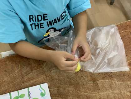 ペットボトルのキャップ、ビニール袋、輪ゴムを使って、手作りのおもちゃを作りました。