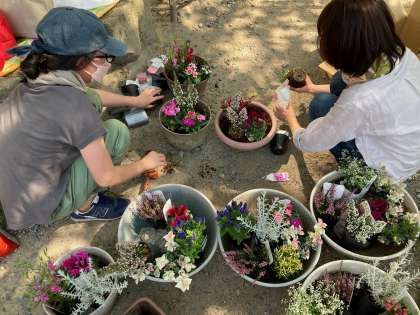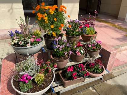PTA総務委員の方々が学校の玄関のお花の植え替えをしてくださいました。