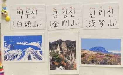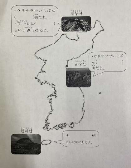 3つの山(白頭山:ペㇰトゥサン、金剛山:クㇺガンサン、漢拏山:ハㇽラサン)についてソンセンニㇺに教えてもらいました。
