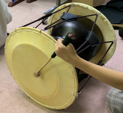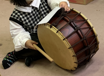 今日のポラム学級では、ソンセンニㇺから楽器のたたき方を教えてもらいました。