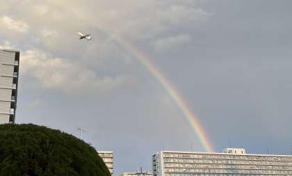 16時50分ごろ、三国小東側の空に大きな虹がかかっていました。