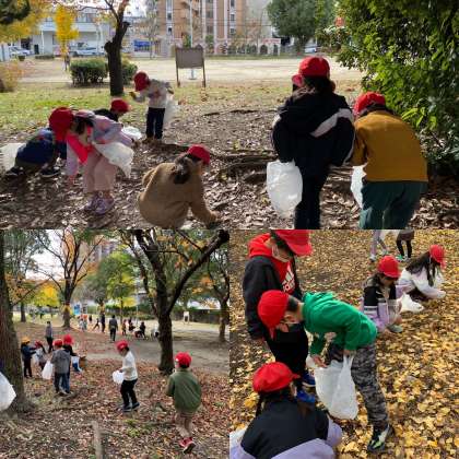公園の木々が紅葉した葉っぱやどんぐりなどを袋いっぱいに集めました。