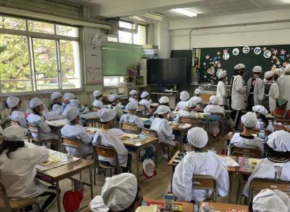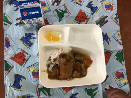 メニューは「入学お祝い献立」のカツカレーとフルーツゼリー。