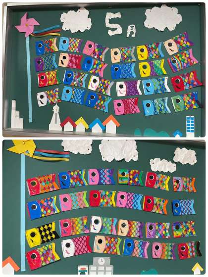 5月に向けて、2年生は、自分の好きな色を選びこいのぼりをつくりました。