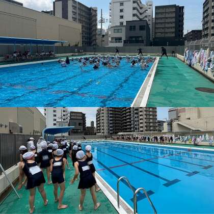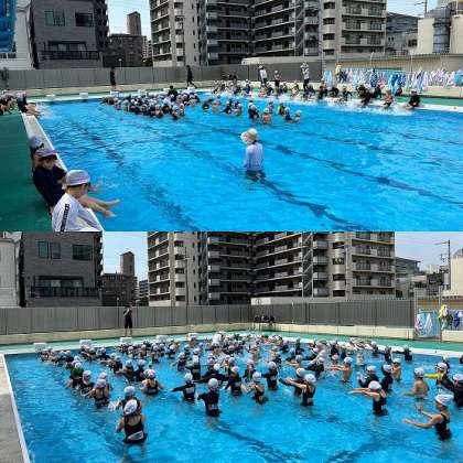 安全に活動できるようにバディを組み、プールの入り方、準備体操など学習の流れについて確認しました。
