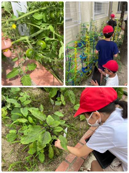生活科で育ててた、きゅうり、なすび、ミニトマトが実り、子どもたちと観察しに行きました。