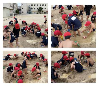 山を作ってトンネルを掘ったり、団子を作ったり、穴を掘ったりするなど、自分たちで砂や土で活動する方法を考え、泥だらけになりながらも楽しんでいました。