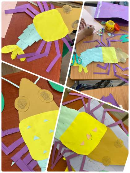画用紙をザリガニの体のパーツに切り取って、のりで貼り合わせます。