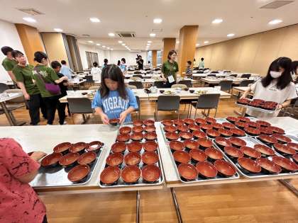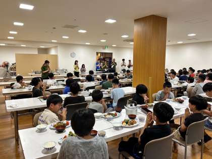 入浴後、食事係が夕食の準備を進めています。