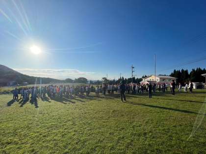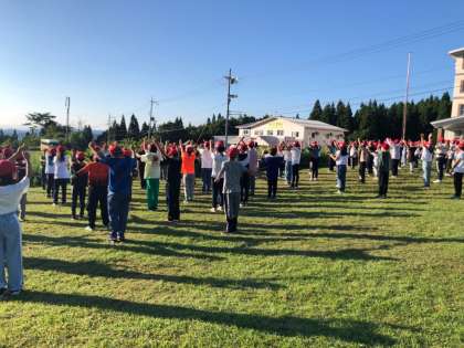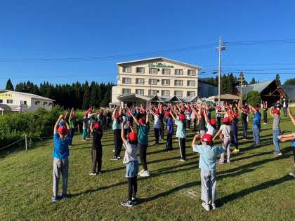朝のつどいでは、朝日を浴びながらラジオ体操で体を動かします。