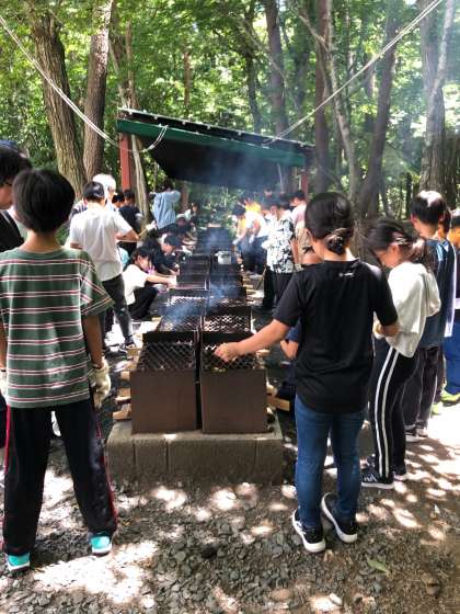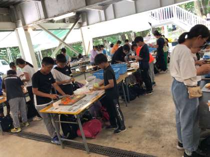 カレーの具材を切ったり、かまどの薪に火をつけたり、班で協力・分担しながら進めています。