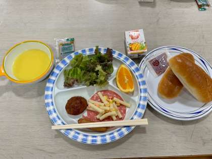 朝ごはんは、マカロニサラダの下に美味しそうなハムが隠れています。