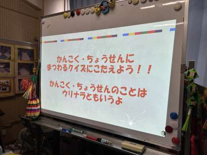 今日は、韓国・朝鮮にまつわるクイズ(あいさつ、食べ物、遊び等)をしました。
