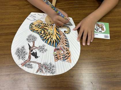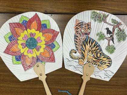 今回は、うちわ(プチェ)に色鉛筆で色を塗りました。