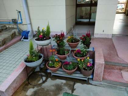三国小学校PTA総務委員の皆様で、玄関のお花の植え替えをしていただきました。