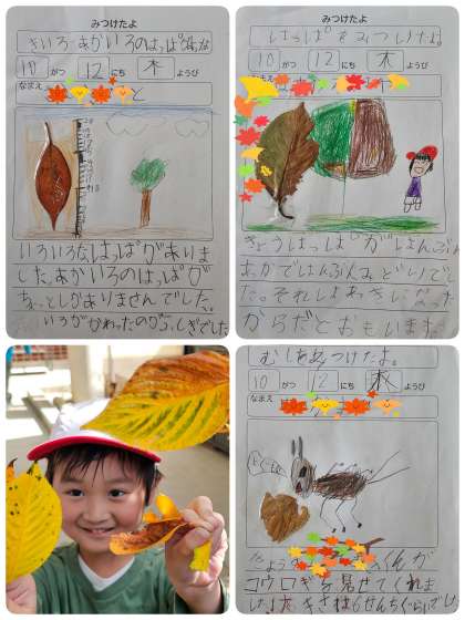 黄色や赤色になった葉やコオロギなど、たくさんの秋を見つけてカードに書きました。
