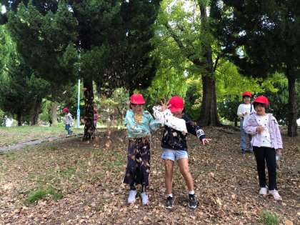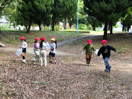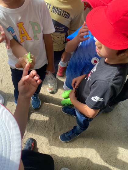 初夏に行ったときにはなかった、落ち葉やどんぐりを見つけて拾ったり、カマキリやバッタなどの虫を探したりしました。