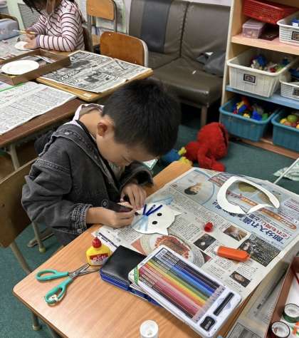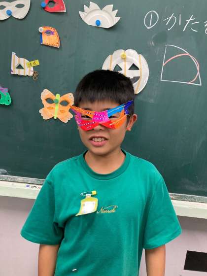 その後、紙皿を使って仮面作りを始めたのですが、半分に切って目の周りを覆うだけの仮面にしたり、全部を使ってお面のように仕上げたりする子もいました。