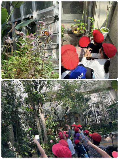 たくさんのチョウが放たれている放蝶園では、蝶が頭に止まったり、たまごをうむ姿を見たりできて、貴重な体験ができました。