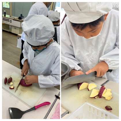 そして、調理開始!全員が一度は包丁を握り、猫の手をして自分の手を切らないように注意しながら、さつまいもをどんどん切っていきました。
