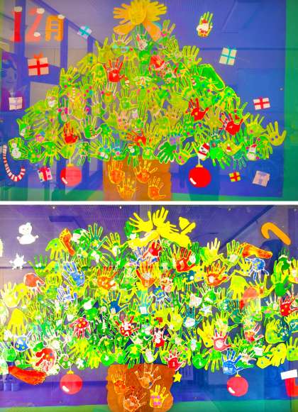 12月の玄関掲示は、2年生の手形や足形で作られたクリスマスツリーです。