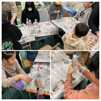 洗濯のりを入れて仕上げをし、蓋をしめて逆さまにするとゆったりと落ちる様子に「きれい〜」と歓声があがっていました。