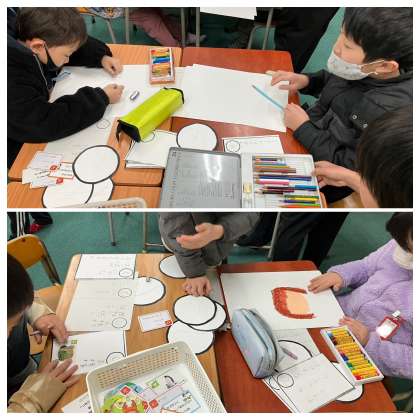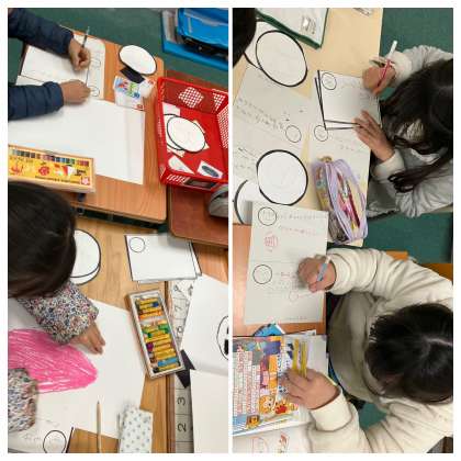 自分でパッと思いつく子もいれば、なかなか思いつかず、友だち同士で「こんなんどう?」「こんな絵描いてみたら?」と話したり、書きたいことにこだわったりして四苦八苦しながらも、自分のイメージに近づけようと頑張っていたりする姿もありました。