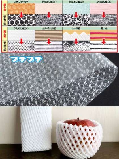 版に使えそうな、プチプチやリンゴの緩衝材、写真に載っているような材料があれば、取っておいてください。