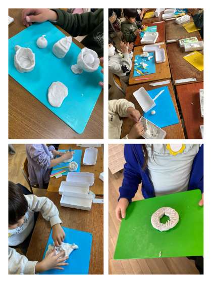 図画工作科の学習で、粘土を使ってごちそうパーティーをしました。
