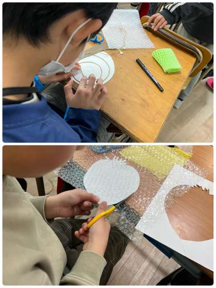 画用紙だけでなく、いろいろな材料を使い、その模様をいかした版を作ります。