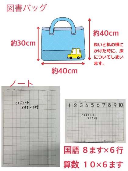 図書の時間に借りた本を入れ、持ち帰りに使います。月曜セット(給食エプロン、体操服、上ぐつ)を入れるバッグとは別のものをご用意ください。図書バッグは机の横にかけるので、下の写真を目安に、床につかない大きさのものをご用意ください。
