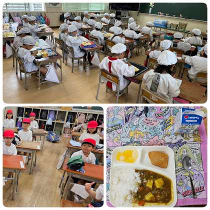 メニューは「入学お祝い献立」のカツカレーとフルーツゼリー。