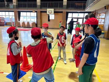 2チームに分かれて、フラフープや平均台、跳び箱などの障害物をクリアしていき、相手チームより早くゴールを目指しました。チームごとに、走る順番や自分たちが有利になるように相手チームの障害物の順番を変えるなどの作戦会議を高学年が率先しました。