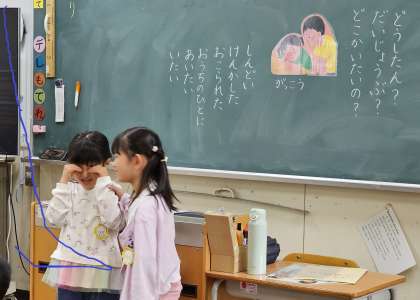 初めての人権学習は、十分文字を読んだり書いたりできない時期の1年生なので、写真のようにイラストを用いて対話形式で学習をしました。