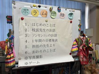 昨日は、ポラム学級の開級式を行いました。開級式では、チョゴリを着て、多くの先生に見守られながら、自己紹介と一年間の目標を発表しました。
