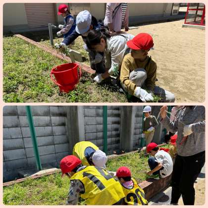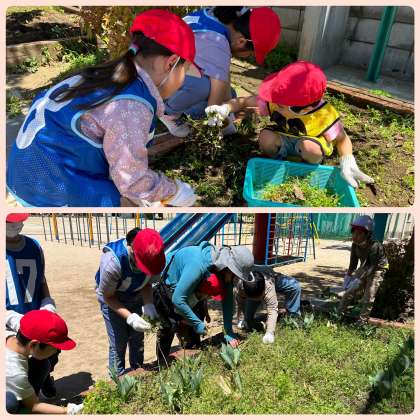 5月14日のなかよしタイムは、「たてわりチーム対抗雑草抜き大会」をしました。今回もたてわりチームに分かれて、学習園の雑草を抜き、その重さを競い合いました。